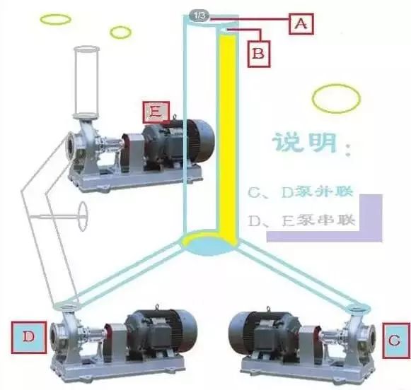 圖中:泵“D“的出口與泵“E”的進口通過管道連接形成串聯(lián),經(jīng)泵串聯(lián)后,介質先進入泵“D”的進口,經(jīng)泵“D”的運行,將介質推送到泵“E”的進口,通過泵”E“的運行,將介質輸送到需要的地方。水泵串聯(lián)實質是階梯輸送的延伸,何為階梯輸送?是指下游的水位太低,而要引入的位置又太高,用一臺水泵運行根本無法“完成使命”。